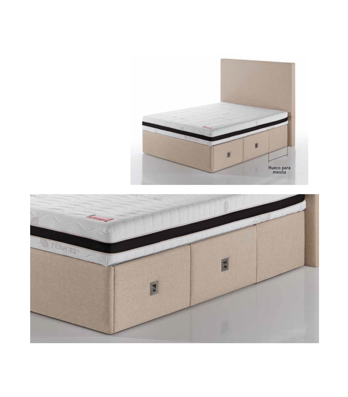 • Tapa tapizada en tejido 3D de alta transpirabilidad en 5 colores  y fabricada con tablero de partículas de madera perforado que favorece y mejora la transpiración del colchón