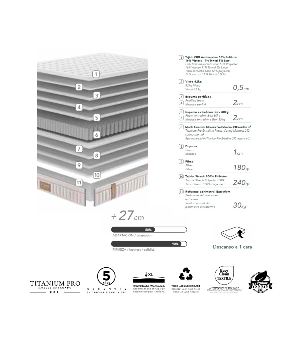 - Con espuma extrafirme de 30 Kg, más espuma perfilada y visco de 42 Kg en la cara superior